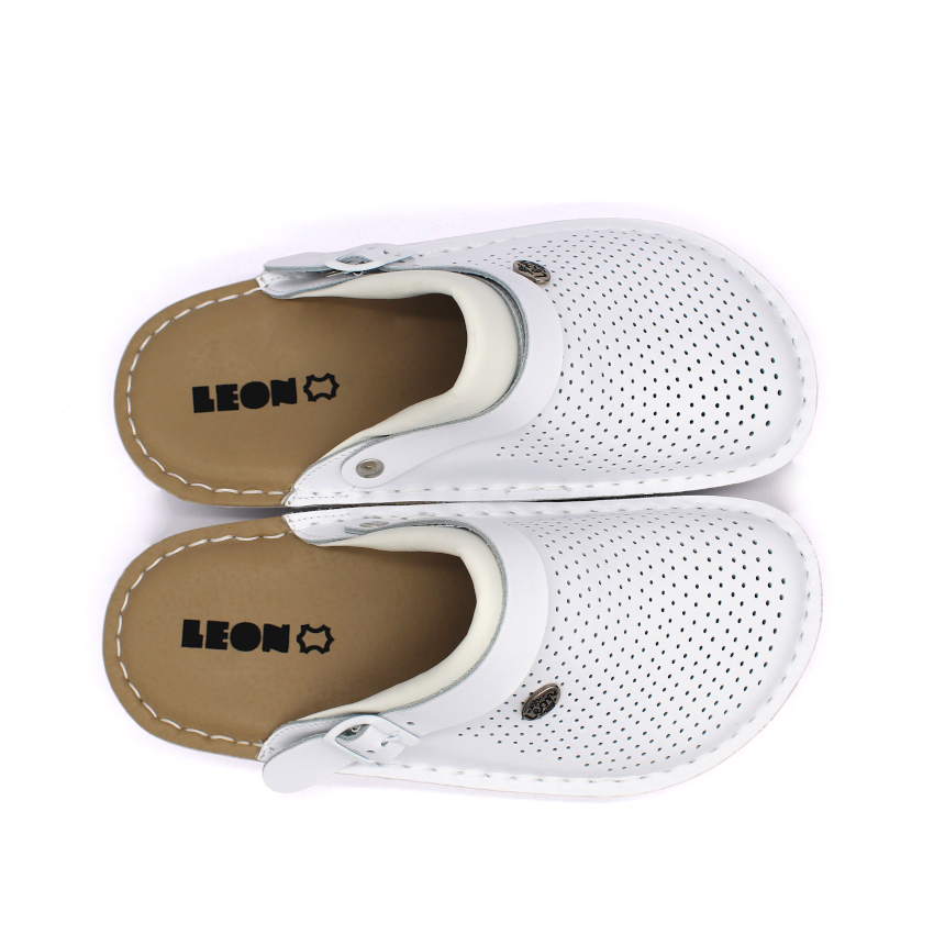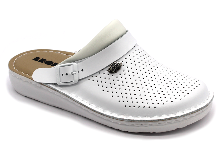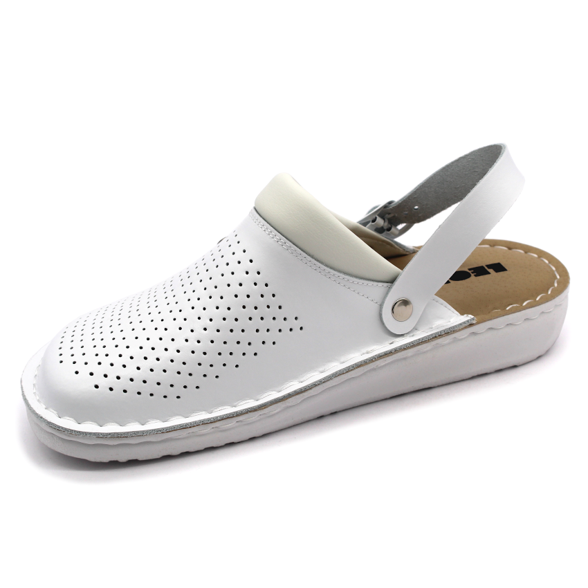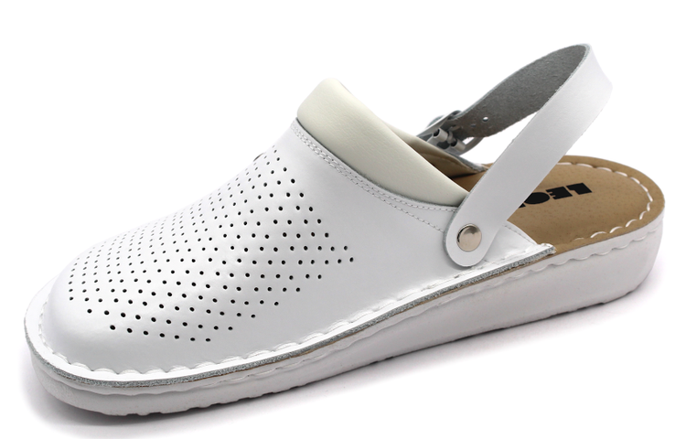 Vďaka otočnému pásiku cez pätu je možné obuv nosiť dvoma spôsobmi – ako klasickú pracovnú obuv s fixáciou päty alebo pohodlne ako papuče či sandále. Perforovaný zvršok z hladkej kože zabezpečuje optimálnu ventiláciu a komfort počas celého dňa.